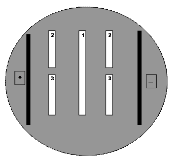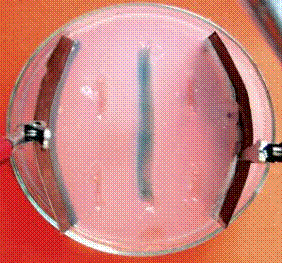 De twee zijkanten van de gelatinewaterzoutlaag zijn met elektroden verbonden met de plus- en minpool van een gelijkspanningsbron.