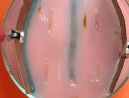 Breng met pipetjes de oplossingen van de kruisproef in de geultjes, voorkom overlopen!
